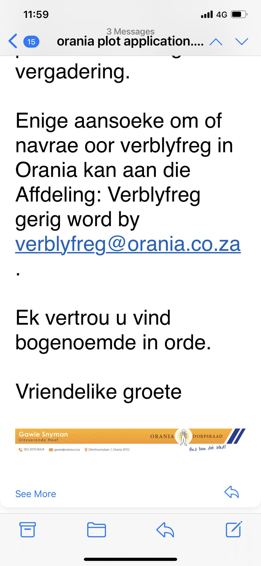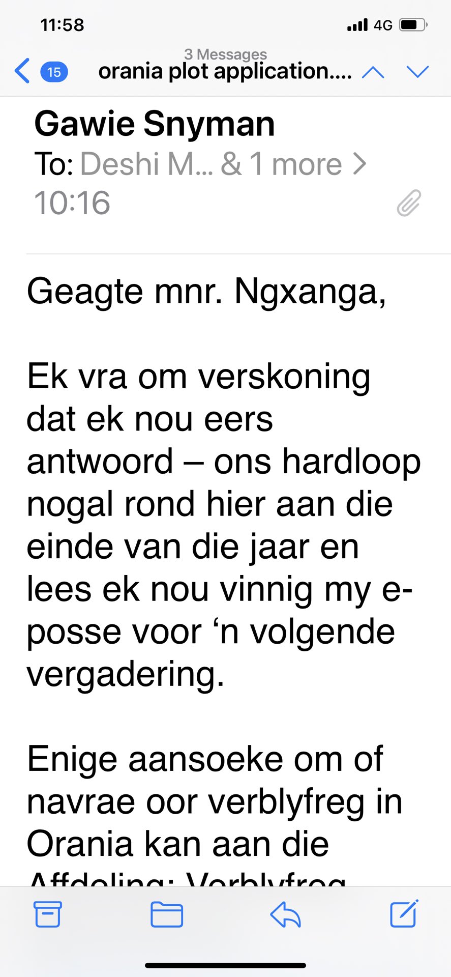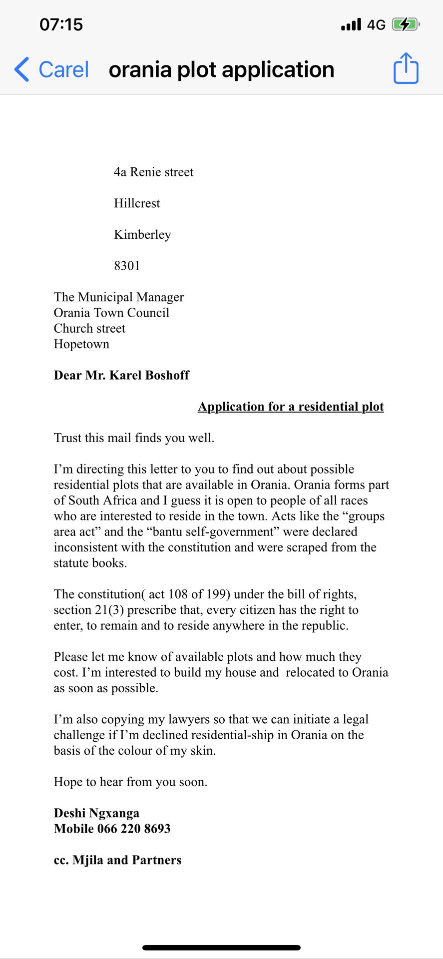 Ngxanga heeft een brief gestuurd aan Carel Boshoff (IV), oud-voorzitter van de Orania Beweging. Daarin vraagt hij of er stukken land in Orania te koop zijn.