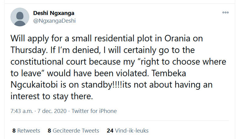 Volgens Ngxanga is het niet van deze tijd is dat er thuislanden zijn of komen, aangezien de Groepsgebiedenwet (de hoeksteen van apartheid, red.) in 1991 is geschrapt. Volgens hem heeft iedereen het recht om ergens te komen, te verblijven of te wonen. Hij geeft aan desnoods tot het Constitutioneel Hof te produceren. In zijn tweets geeft Ngxanga aan niet echt in Orania te willen gaan wonen.